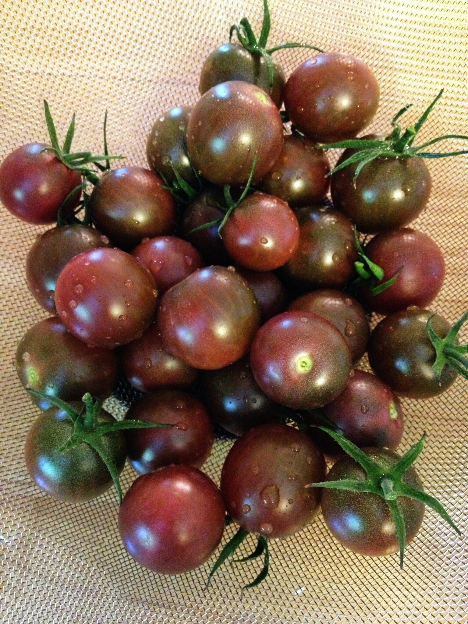 Appearing in clusters of 8 all over this compact vining plant, these 1" cherry tomatoe ripen from green to the richest mahogany. You will not find flavor this bold in a store bought variety! Indeterminate. 70 days