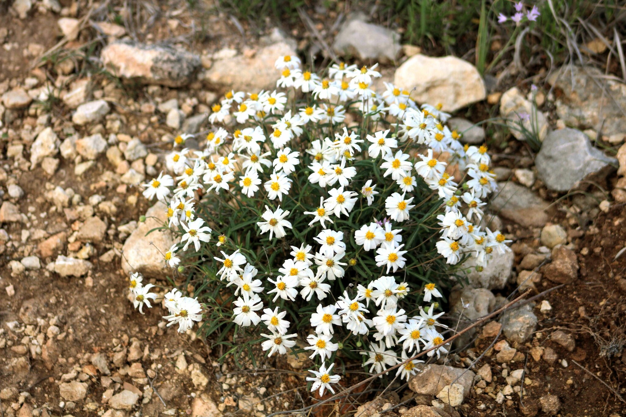The Blackfoot daisy (Melampodium leucanthum) is a hardy, evergreen perennial native to the southwestern United States and Mexico. It features small, daisy-like flowers with bright yellow centers and pure white petals that bloom profusely from spring through fall. This low-growing plant typically reaches 12 to 18 inches in height and spreads similarly, forming a dense, mounding ground cover. It thrives in full sun and well-drained, rocky, or sandy soils, making it highly drought-tolerant once established. Popular for xeriscaping and rock gardens, it is also deer-resistant and attracts pollinators like butterflies and bees.